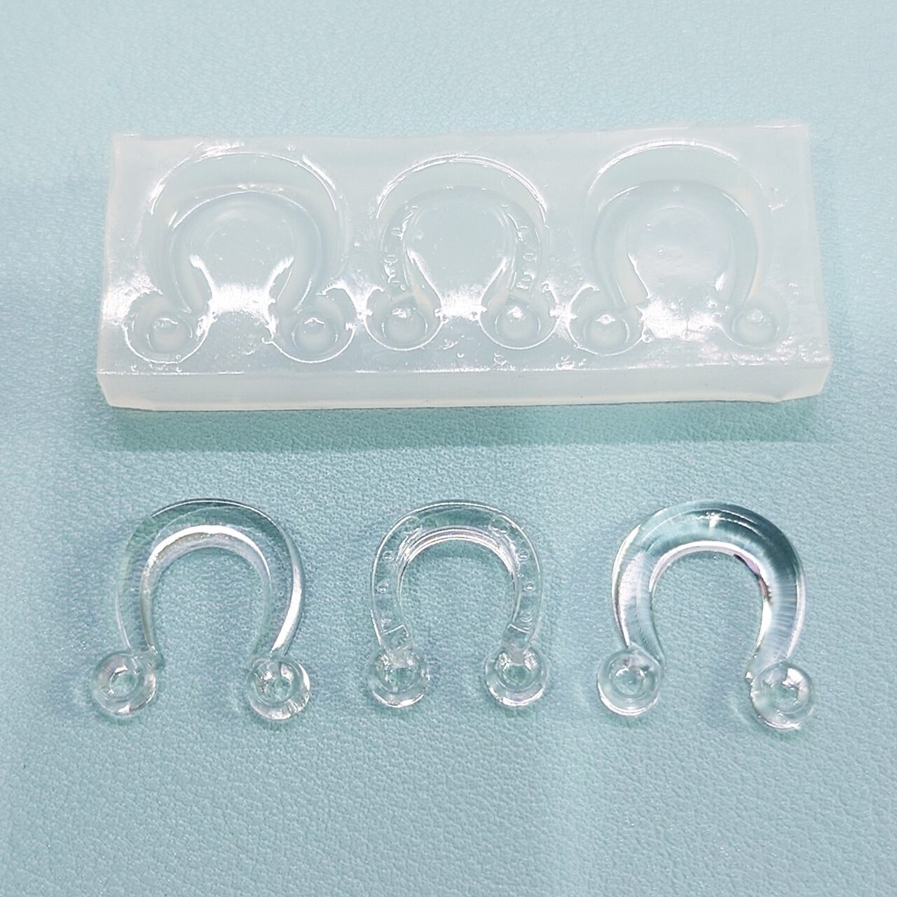 このモールドでは、多彩な馬蹄の形を楽しむことができ、丸カンが下に付いているので、紐やワイヤーを通すアクセサリー作りにぴったりです!